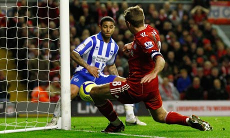 Hér eftir átti Liverpool leikinn með húð og hári þótt Brighton stæði sig vel fram að leikhléi. Á 27. mínútu braust Luis Suarez framhjá tveimur varnarmönnum og kom boltanum framhjá Peter í markinu en Inigo Calderon náði að bjarga á marklínu. Fjórum mínútum seinna eða svo sendi Steven Gerrard hárnákvæma sendingu á Andy Carroll en hann skallaði yfir úr mjög góðu færi.